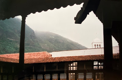 We continued the seventeen kilometers across the level caldera of the volcano - one of the largest in the world. Gradually we started to descend the far side down a twisting, deserted road until we entered the seemingly endless pine forest again. We turned off at Vilafor, at 1,400 meters above sea level.the highest town in Tenerife, a pretty little place, full of wild flowers, with little houses, a pleasant paved square with a fountain surrounded by terraces supporting vines. The gardens are full of orange and lemon trees supporting glorious fruits of enormous size, and almond trees line the roadside.There is a long, lemon rendered church of very simple external design with a low roof of red tiles and a convent behind. The church is dedicated to Hermano Pedro (Brother Peter), who must have been a missionary to Guatemala, as the republic had erected a statue to him in the village square. Almost all the houses in the older upper part of the town bore enamel plaques outside in recognition of the work of Hermano Pedro and flags and banners to him hung from the lamp posts and the cafe. Obviously they were extremely proud of him.